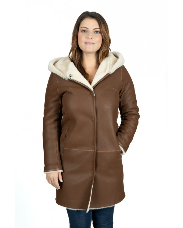 Manteau réversible en peau lainée de mouton à capuche (non amovible).